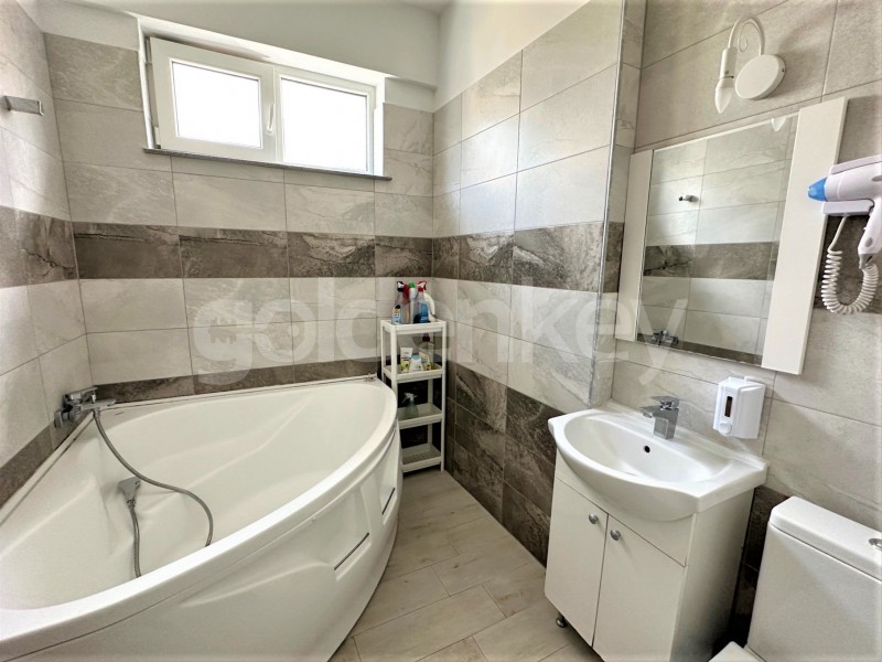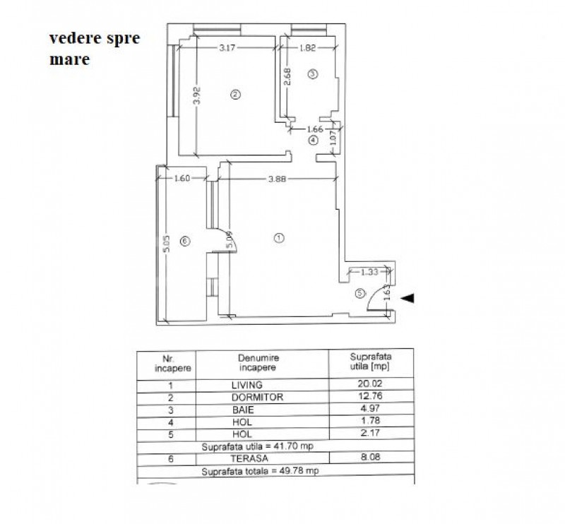Suprafata construita este de 58 mp construiti, 42 util + 8 mp balcon, si este compus din living cu bucatarie deschisa si acces catre balcon, dormitor matrimonil cu vedere panoramica catre mare , si baie.