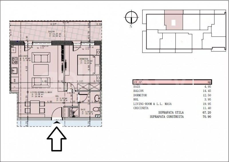 Apartmentul are o suprafata construita de 71 mpc, utila 67 mp ( 53 mp + 14 mp balcon ) si este compus din living cu bucatarie deschisa si acces catre terasa, dormitor si baie. Acesta se vinde complet utilat mobilat.