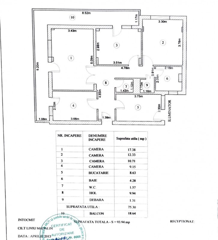Suprafata totala construita este de 112 mp , utila 94 mp si este compus din living 17.38 mp, bucatarie inchisa 8.63mp , dormitor 1 - 12.33 mp, dormitor 2 - 10.71 mp, dormitor 3/ birou 9.15 mp, baie 4,28 mp, grup sanitar 1,57 si balcon inchis 18.64 mp..
