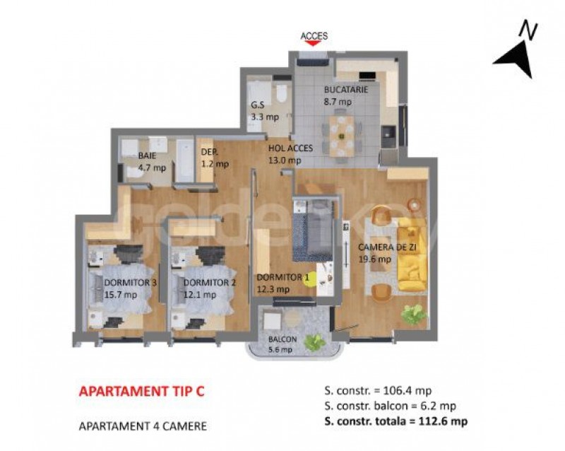 Are o suprafata totala de 112.6mp, 90.6mp utili si 5.6mp terasa.
