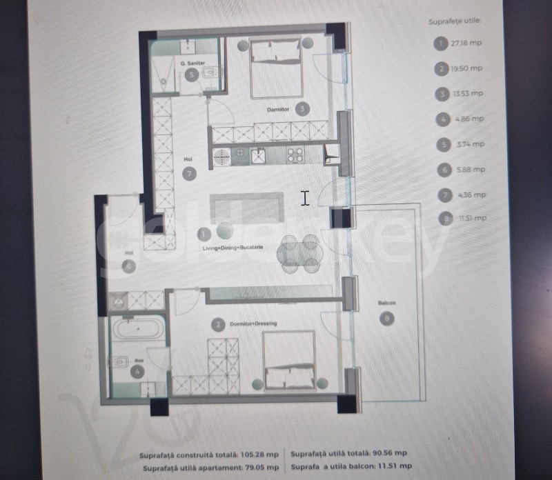 Are o suprafata totala de 105.28mp, 79.05mp utili si 11.51mp terasa.