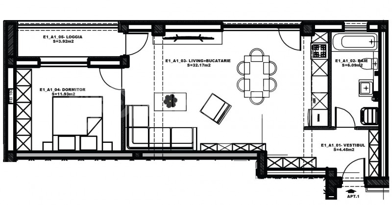 Este compus din living cu zona de dining si bucatarie de 32mp, dormitor de 14mp cu zona de dressing si baie de 6mp.