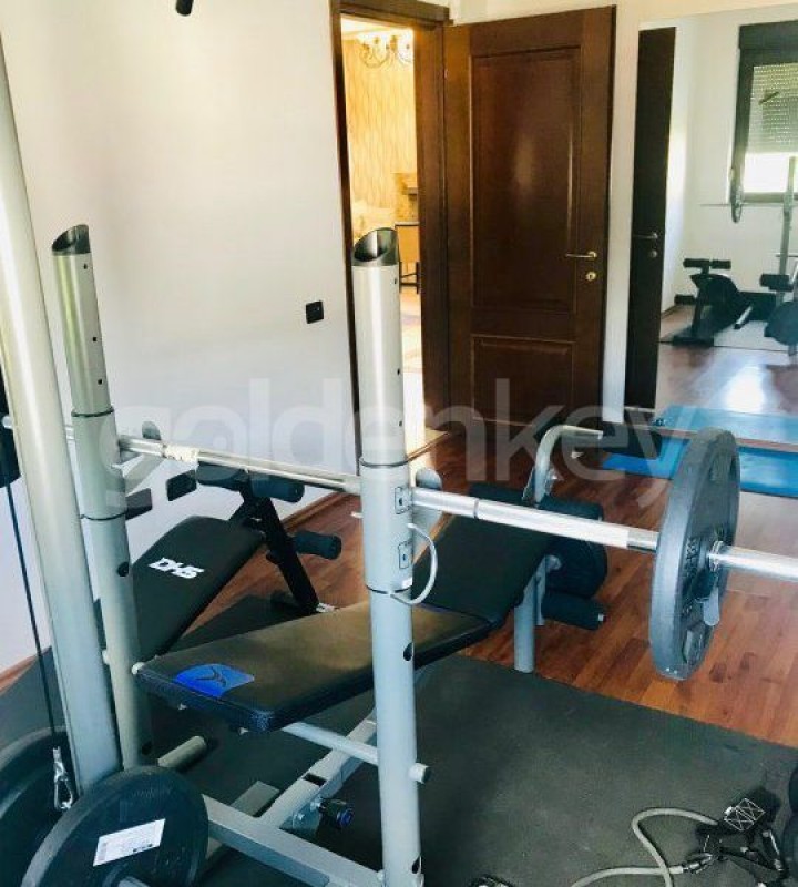 Parterul este compus din living spatios (67mp si 7m inaltime) cu iesire pe terasa si in gradina, piscina interioara, bucatarie separata, birou/dormitor, baie, sala de fitness cu baie, sauna, camera tehnica si garaj pentru 2 masini.