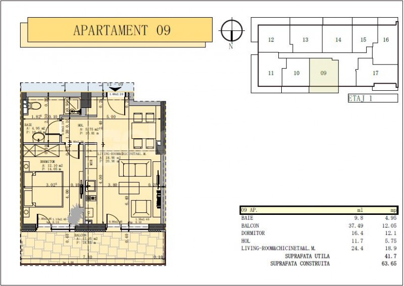The apartment has a built area of 63 sqm, usable 57 sqm (42 sqm + 12 sqm balcony) and consists of a living room with open kitchen and access to the terrace, bedroom and bathroom.