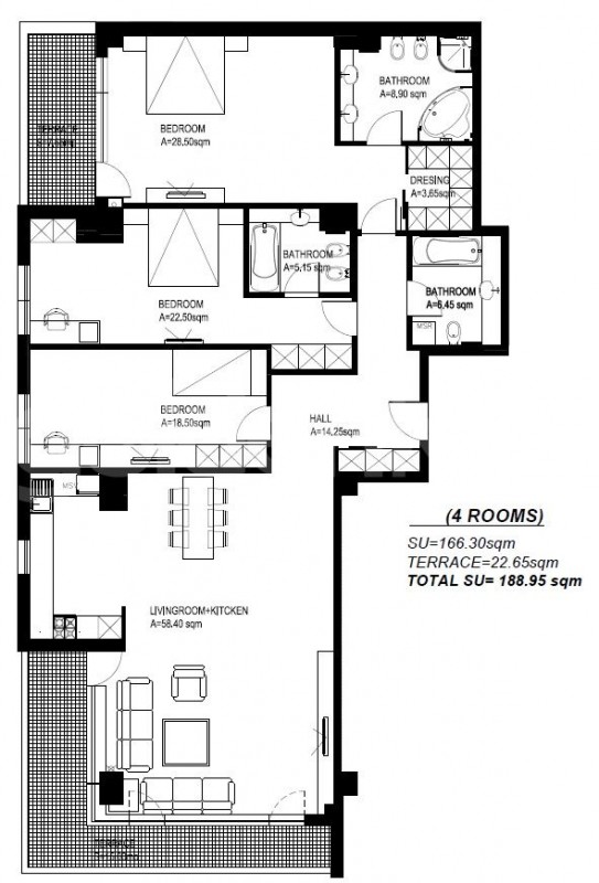 It is composed of a bright living room with access on the terrace, fully equipped open kitchen, master bedroom with en suite bathroom, dressing and exit on the terrace, secondary bedroom with en suite bathroom, 3rd bedroom and secondary bathroom.