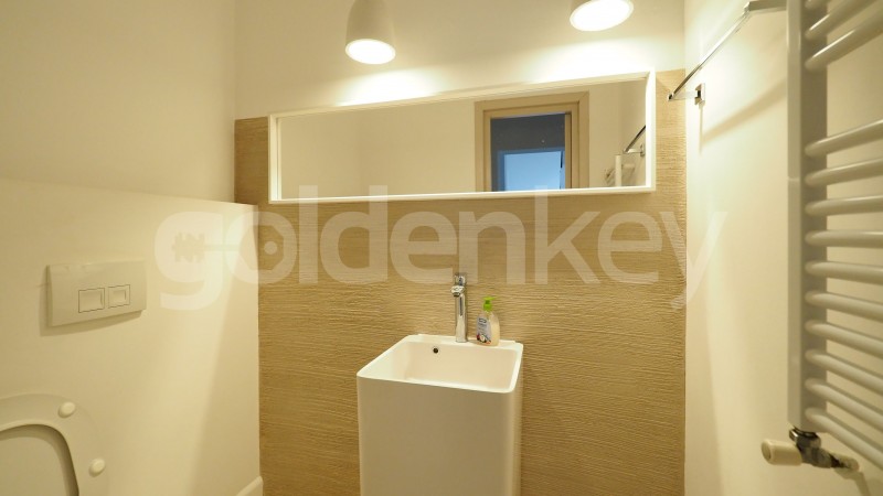 The ground floor consists of a living room with dining area, office/bedrom, guest toilet, separate equipped kitchen, technical space with laundry and garage.